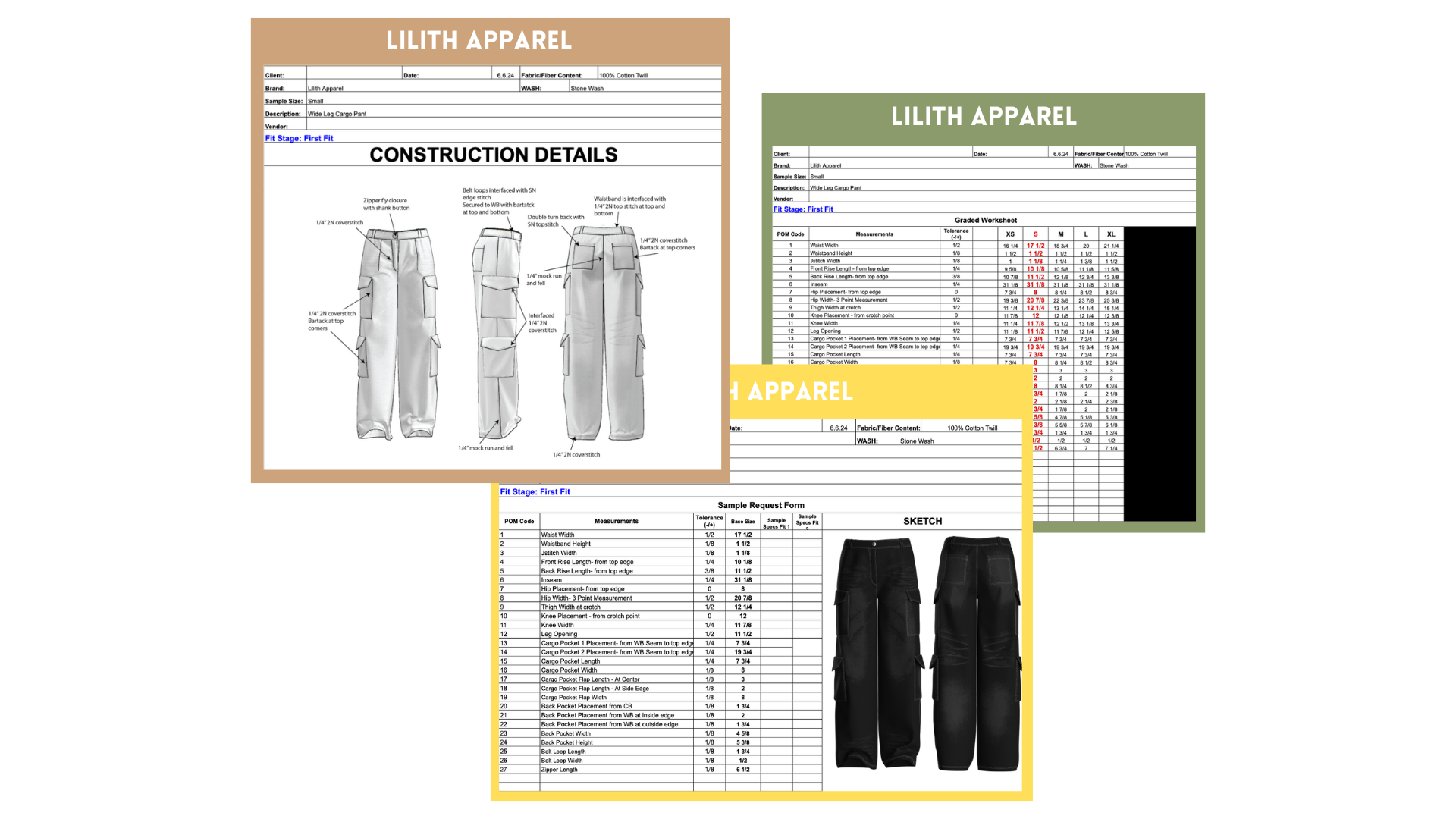 A Lilith Apparel tech pack includes: